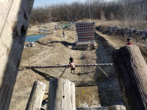 One of the best experiences is just after picking up your bib at the registration counter, there is a ridge near the metal dirt runner sign where you can see many of the insane obstacles below. From that viewpoint the viewer can scope out the bonfire area where everyone gathers because the weather is still hovering in the low 30’s.